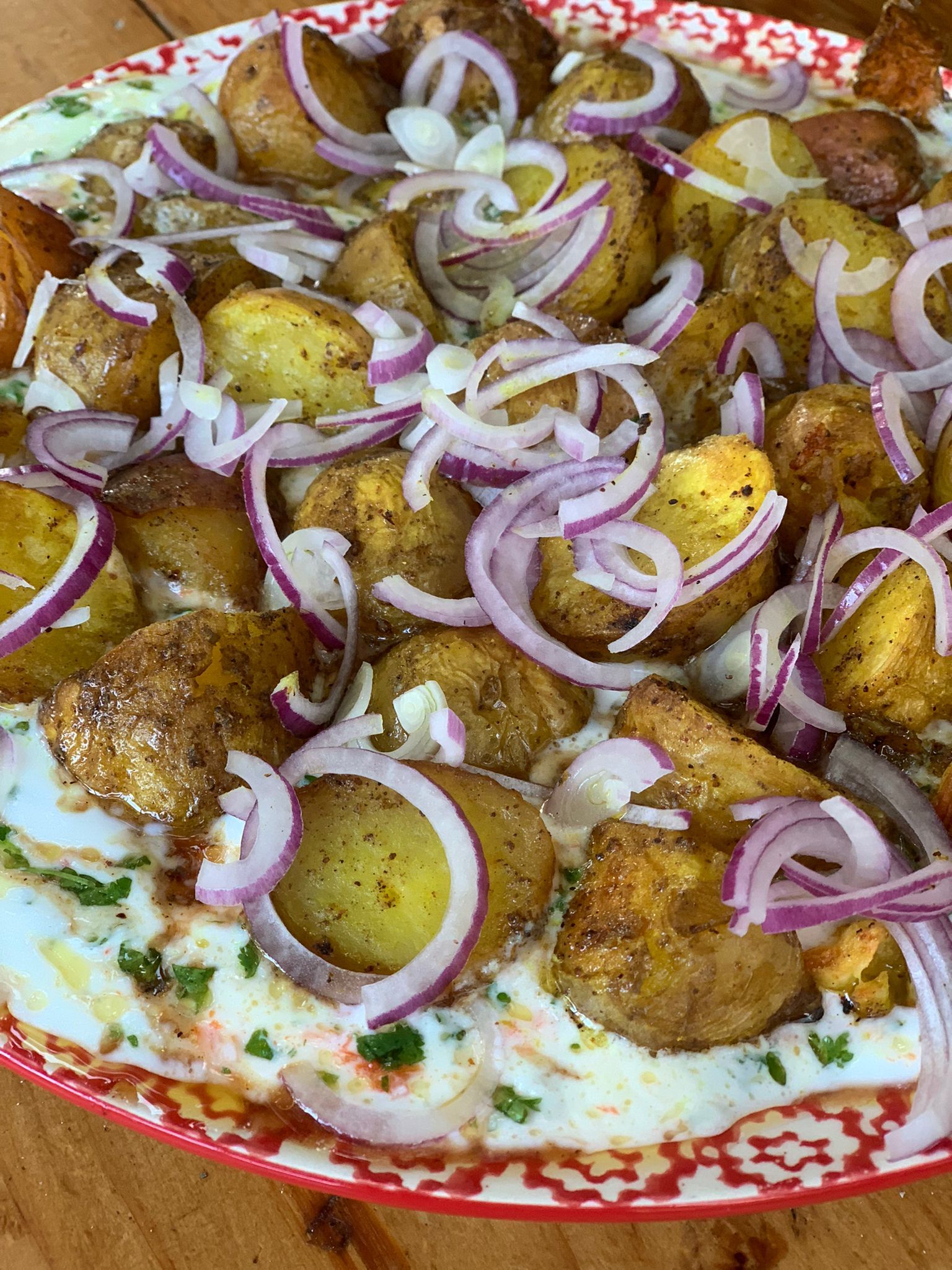 Als de aardappels klaar zijn, zet ze over op het bord met yoghurt, bestrooi met dun gesneden rode ui en besprenkel het met de dressing.