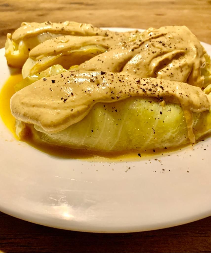 Was en snij de kool in vier parten. Meng de appelsap, water, citroen en kruiden samen. Verhit in en grote koekenpan de olie en doe de parten kool in en bak ze aan beide kanten totdat ze mooi goudbruin zijn. Schenk dan de mengsel van kruiden onderin, zet de temperatuur laag en laat het met een deksel op 20 minuten sudderen. Maak ondertussen een tahinidressing. Serveer de kool met tahinidressing bijvoorbeeld bij een bramboraky of een quiche.