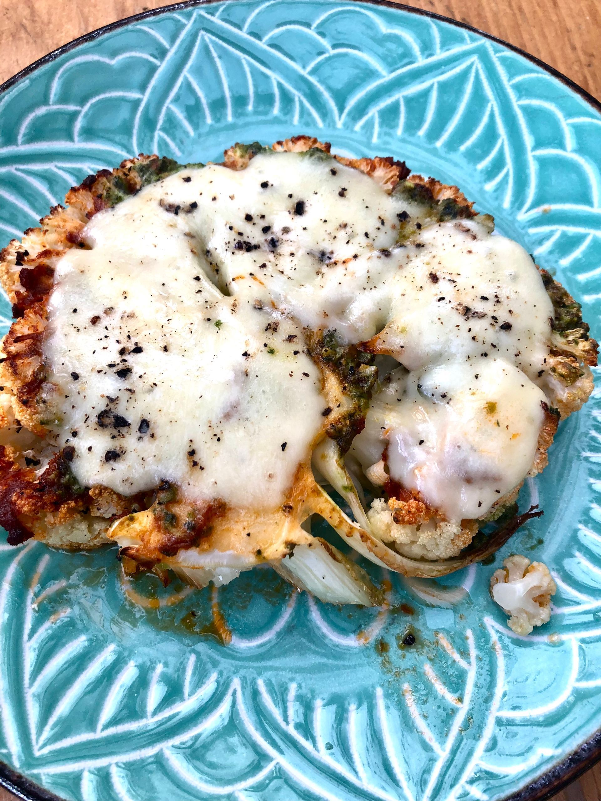 Als de bloemkool gaar us, smeer het met de tomatensaus, leg er op de basilicum blaadjes, mozzarella en strooi of maal een beetje zwarte peper op. Leg nog voor 5 minuten in de oven zodat mozzarella mooi gesmolten is.