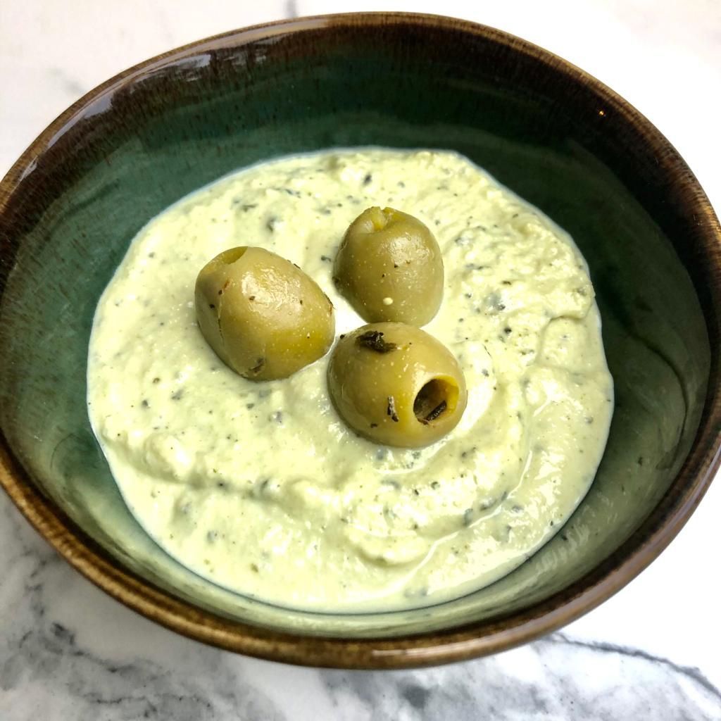 Bak blokjes courgette in olijfolie en doe ze vervolgens in een elektrische molen. Voeg alle andere ingrediënten toe en maal ze totdat het een mooie romige dip is geworden. Garneer met een paar olijven en serveer samen met rauwe stukjes wortel en komkommer. Het is ook heerlijk op een crackertje.