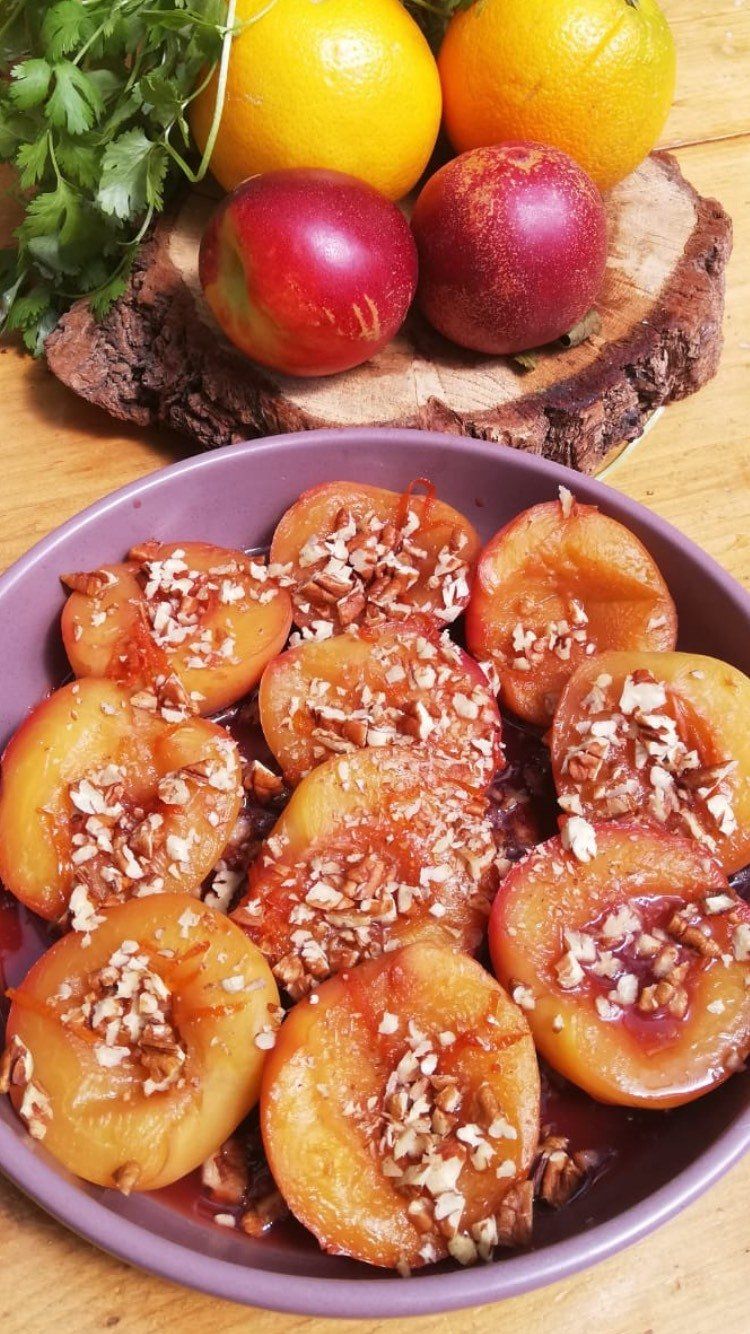 Před podáváním posypte nektarinky vodou z pomerančových květů a nasekanými pekanovými ořechy.