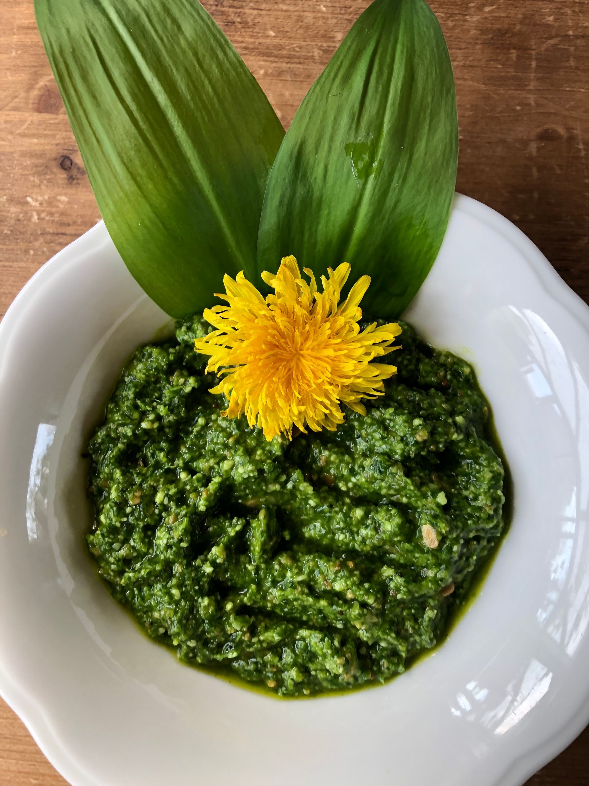 Daslook groeit uit heel lang dus pak je kans als je de mooie jonge blaadjes ziet, pluk een paar, samen met een paar paardebloemenblaadjes en pak je kans. Je kunt met deze peso heel veel doen - pasta pesto maken, op een brood smeren, in een dressing doen en nog meer.