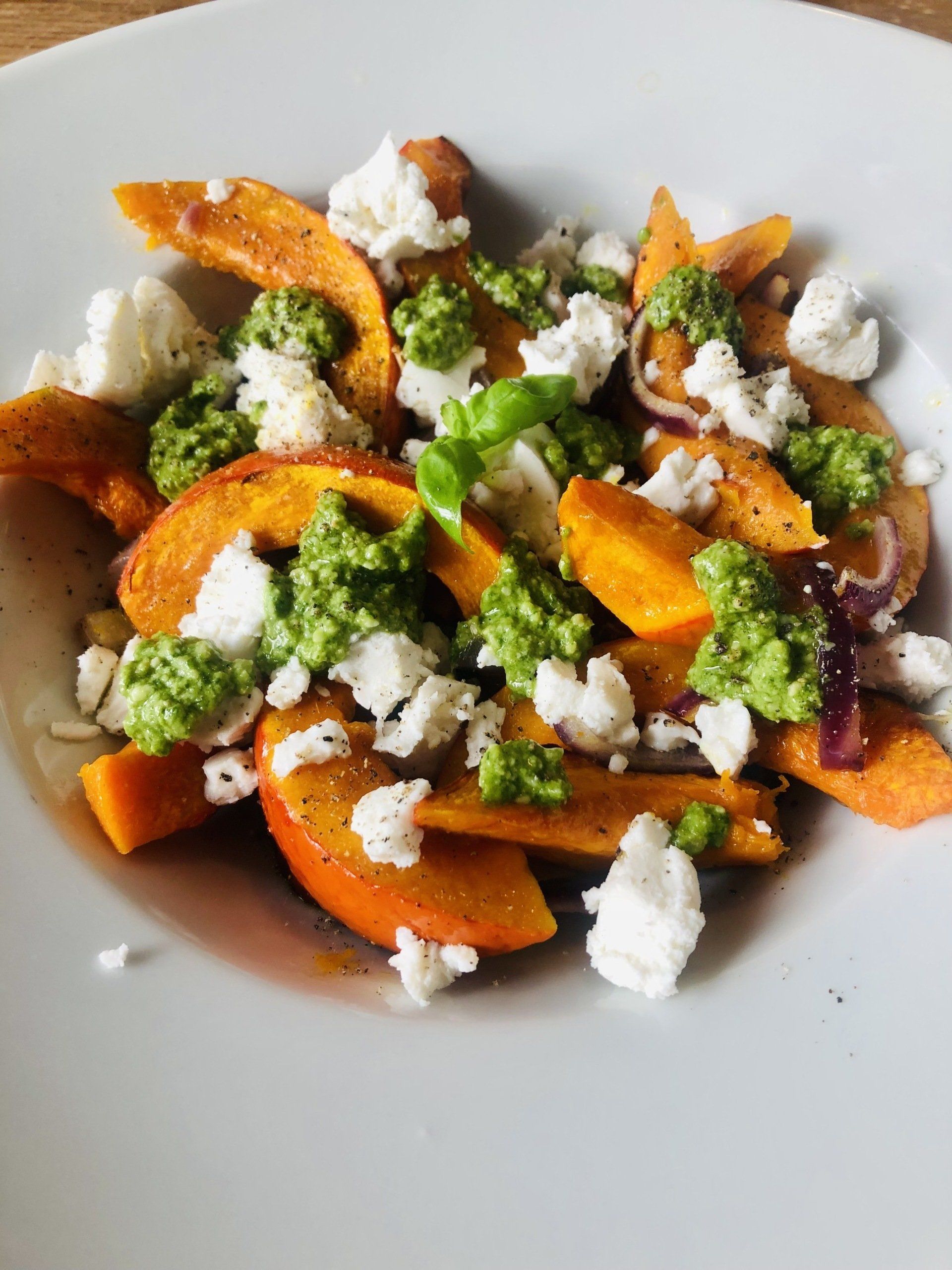 Dit makkelijk en heerlijk gerecht is in handomdraai klaar en perfect om te eten voor een lunch. De combinatie van een zoete een verwarmende pompoen samen met verkoelende geitenkaas en pesto zorgt er voor dat er alle types ervan kunnen genieten zonder dat er iets uit balans komt.