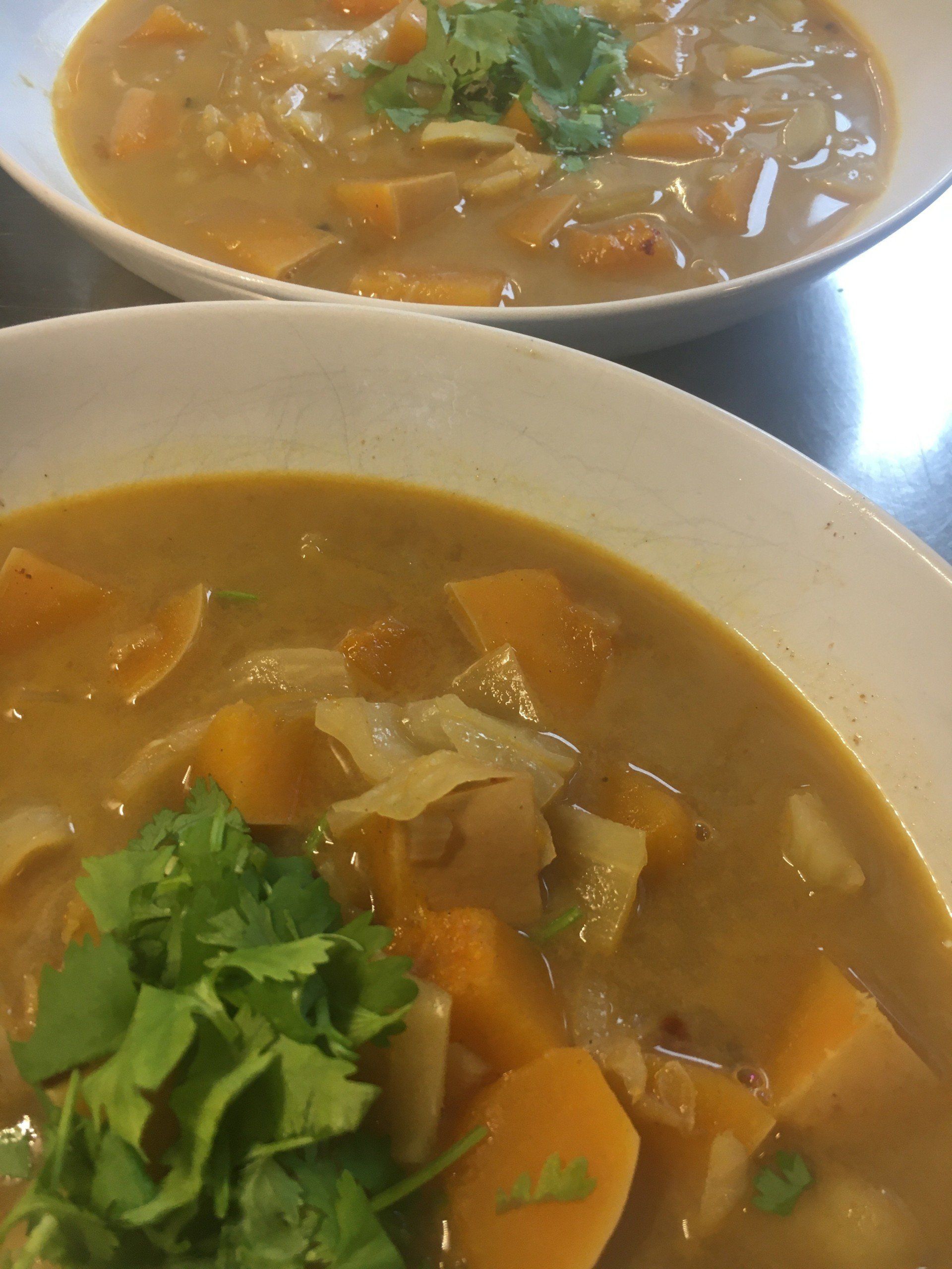 Pak een soeppan en laat de ghee er in smelten. Bak paar minuutjes de ui, knoflook en gember. Doe er gesneden groente erbij en linzen Ras el hanout erbij en laat paar minuutjes bakken.
