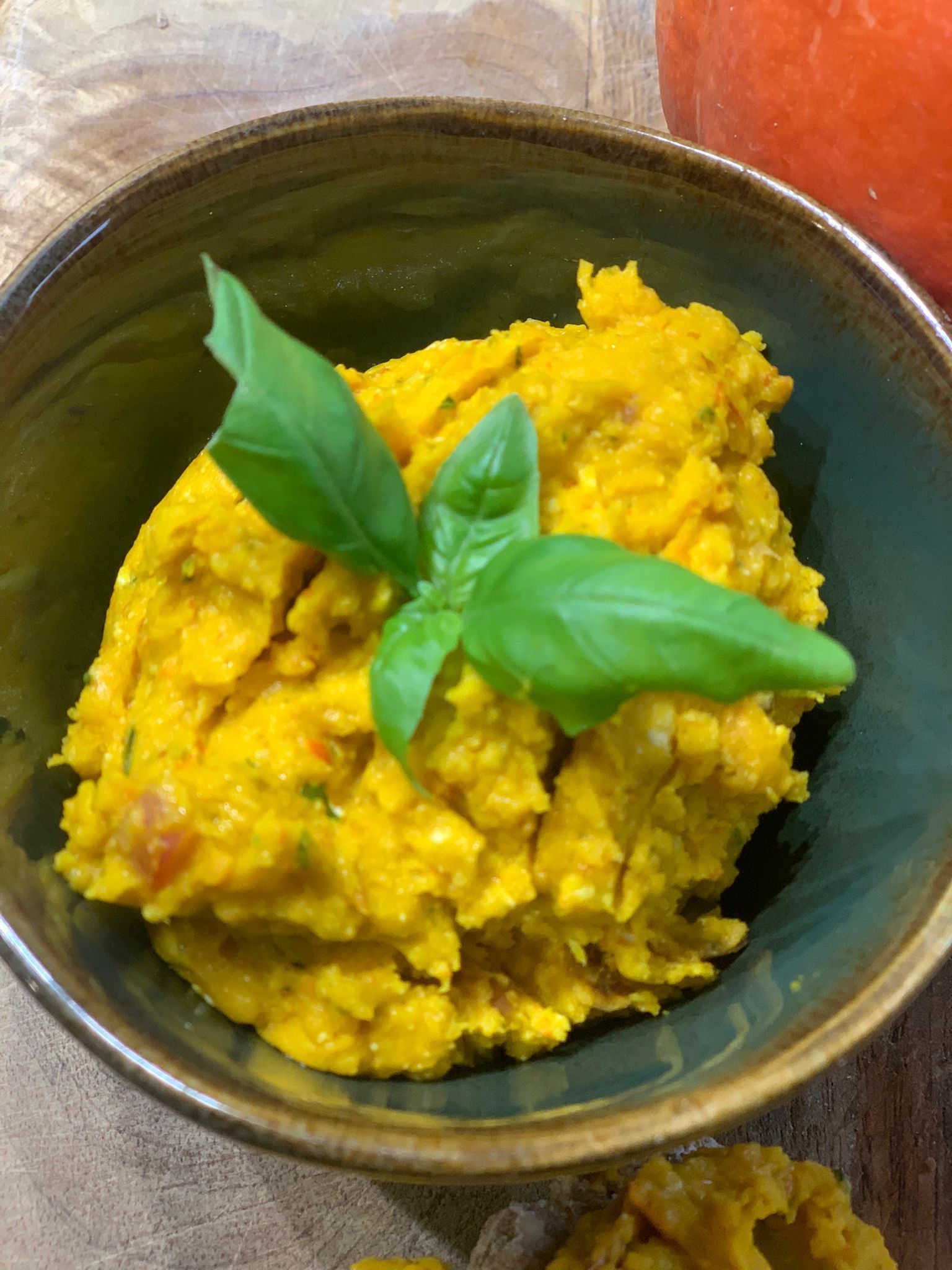 Vervolgens doe je de pompoen en ui in een keukenmachine samen met de overige ingrediënten, en maak je er een heerlijke spread van. Voeg eventueel een beetje water toe om het smeerbaar te maken. Serveer met crackers of flatbread.