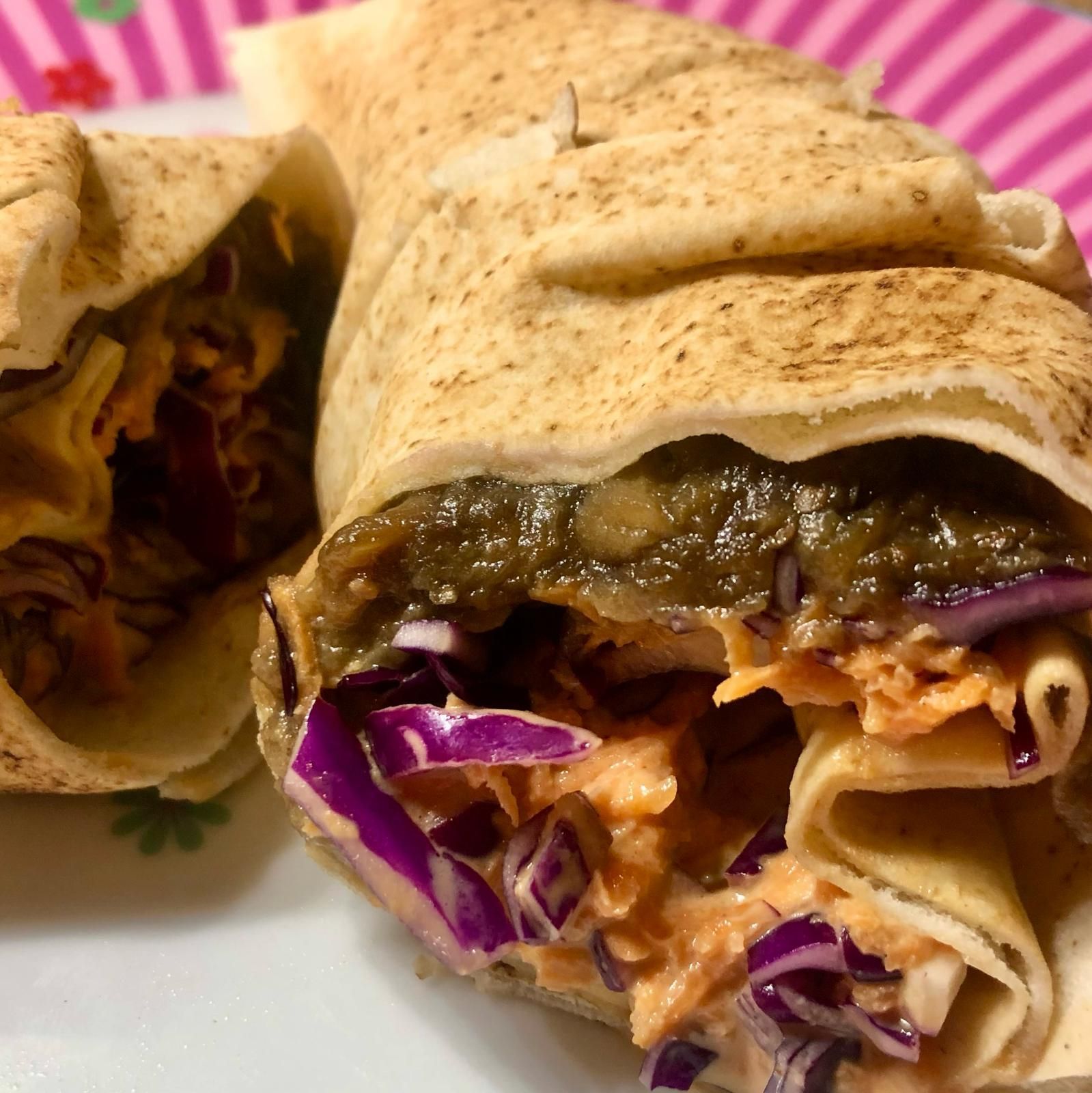 Maak salade van fijn geraspte wortel en heel dun gesneden rode kool. Meng er doorheen de rest van de ingrediënten.