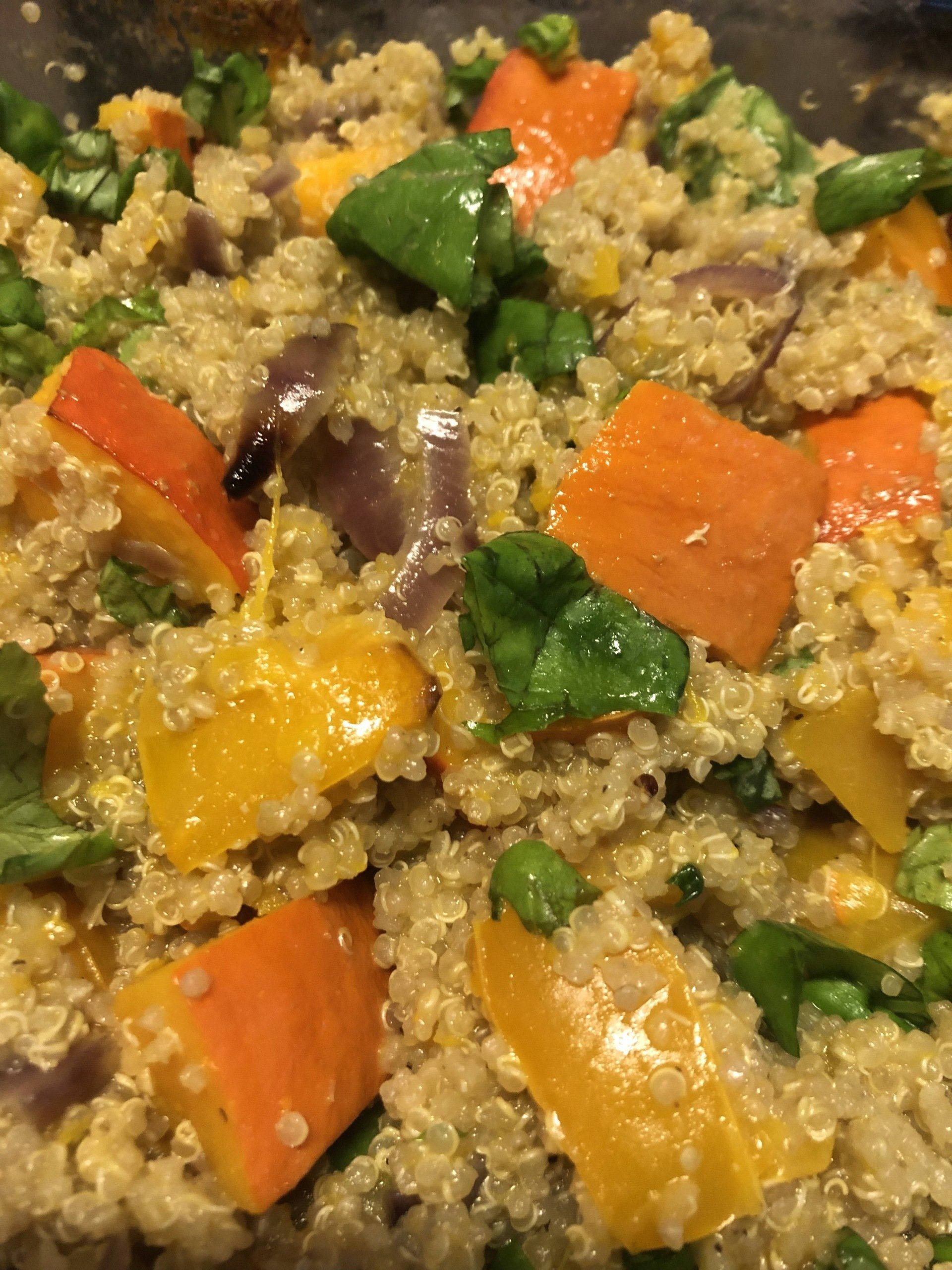Verwarm de oven op 200 graden. Maak de pompoen schoon en snijd hem ongepeld in blokjes. Snijd de paprika in stukjes die ongeveer zelfde maat hebben. Snijd de uien in halve ringen. Schep alles in een ovenschaal en meng er de kokosmelk, ghee, limoenblaadjes, chilipepers en peper en zout doorheen en laat 30-40 minuten bakken. Kook ondertussen de quinoa gaar en hak de basilicum. Wanneer de groenten gaar is, meng er de quinoa doorheen samen met citroen sap en basilicum.