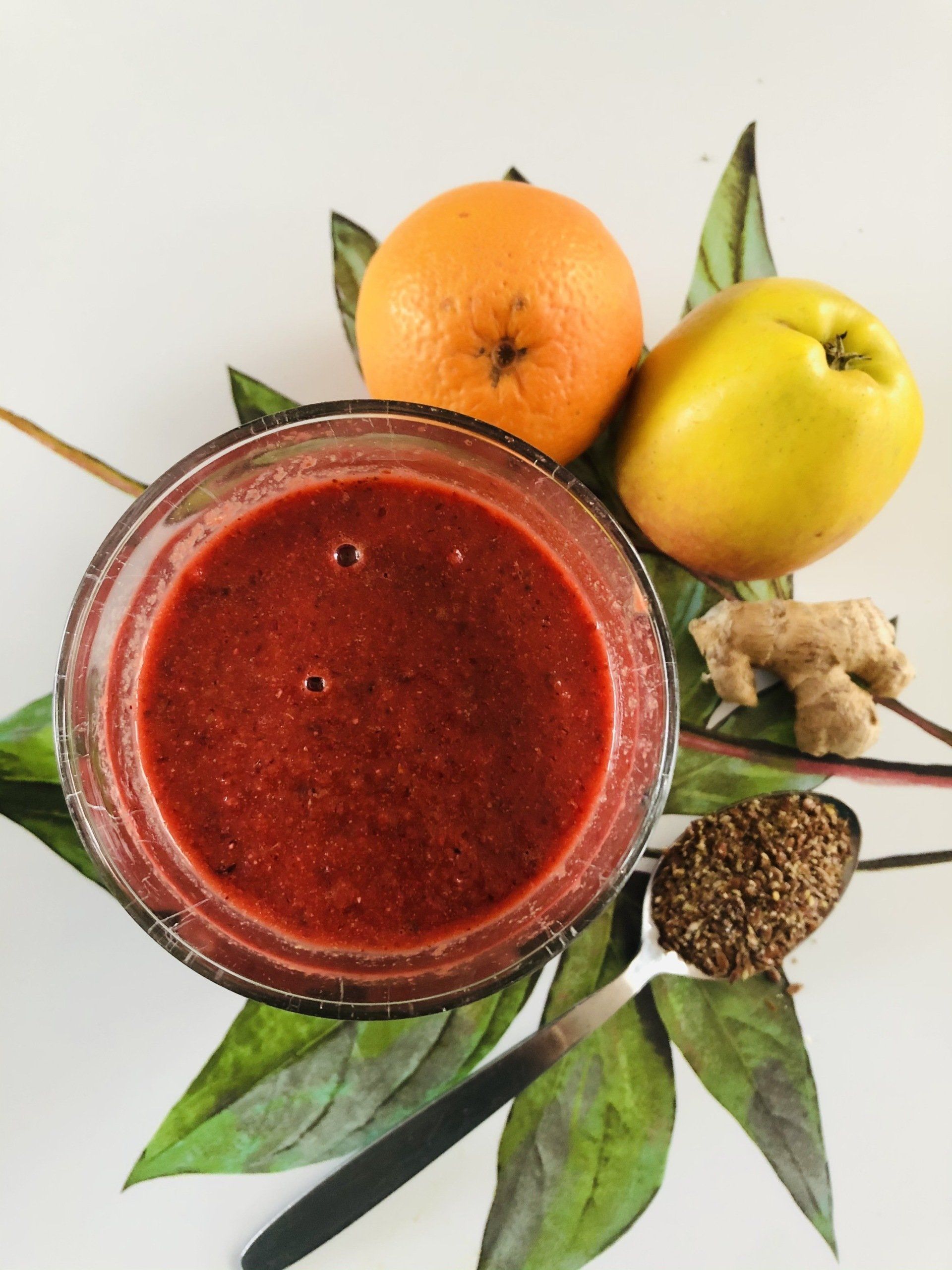 Elke ingrediënt in dit supergezonde drankje heeft een functie. Appel en sinaasappel zijn sterk reinigend voor verschillende gebieden. Voornamelijk appel helpt afvalstoffen en zware metalen te verwijderen en slechte cholesterol omlaag brengen. Sinaasappel helpt tegen ontstekingen, versterkt tanden en bevat veel vitamine C. Een bietje samen met een appel en kurkuma is geweldig om lever te reinigen. Een bietje is ook goed voor bloed en helpt menopauze te reguleren. De kruiden helpen om alles goed te verteren en hebben reinigende werking op het lichaam. Zwarte peper versterkt werking van kurkuma, die helpt met het verteren van suikers, vetten en oliën. Lijnzaad is een van de zaadjes met veel geweldige eigenschappen. Ze zijn onder andere reinigend, hebben veel vezels, verhogen weerstand en zijn behulpzaam bij PMS en ontstekingen. Kokosvet zorgt er voor dat je je verzadigd voelt en dat de vitamines van de fruit en groente goed in het lichaam worden opgenomen.
