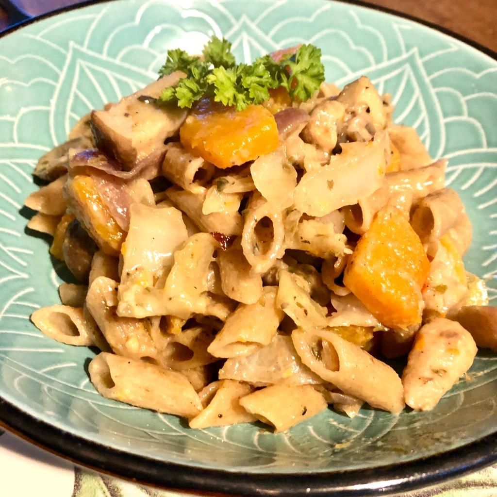 Bak in een grote koekenpan gesnipperde uitje op olijfolie. Voeg er gesneden champignons erbij, laat even bakken, voeg vervolgens reepjes gesneden spitskool en in blokjes gesneden pompoen. Laat zachtjes samen 5 minuten bakken en voeg er vervolgens wijn erbij, room, 1 eetlepel oregano, zout en zwarte peper bij. Laat zachtjes sudderen.