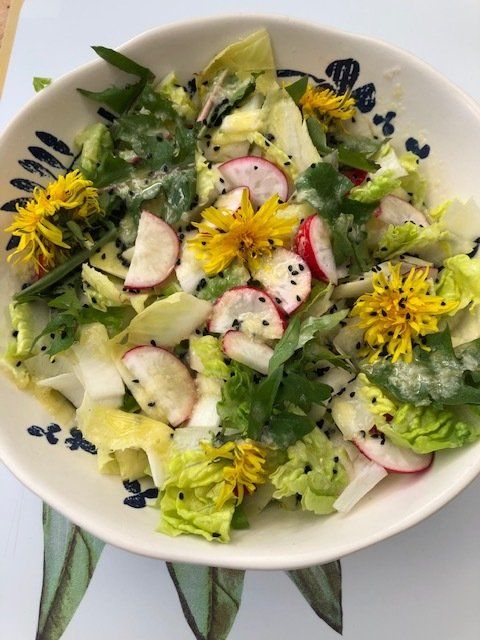 Snijd de witlof, bindsla, rucola en paardebloemenblaadjes in reepjes, doe het in een kom. Snijd de radijsje in plakjes of blokjes (wat je lekker vindt). Snijd de bosuitje klein en meng ze beide door de sla. Maak een dressing en giet over de salade. Bestrooi met Nigela zaadjes en meng goed door elkaar. Verseer met de paardebloemen en serveer bijvoorbeeld bij een risotto of een vleesgerecht..