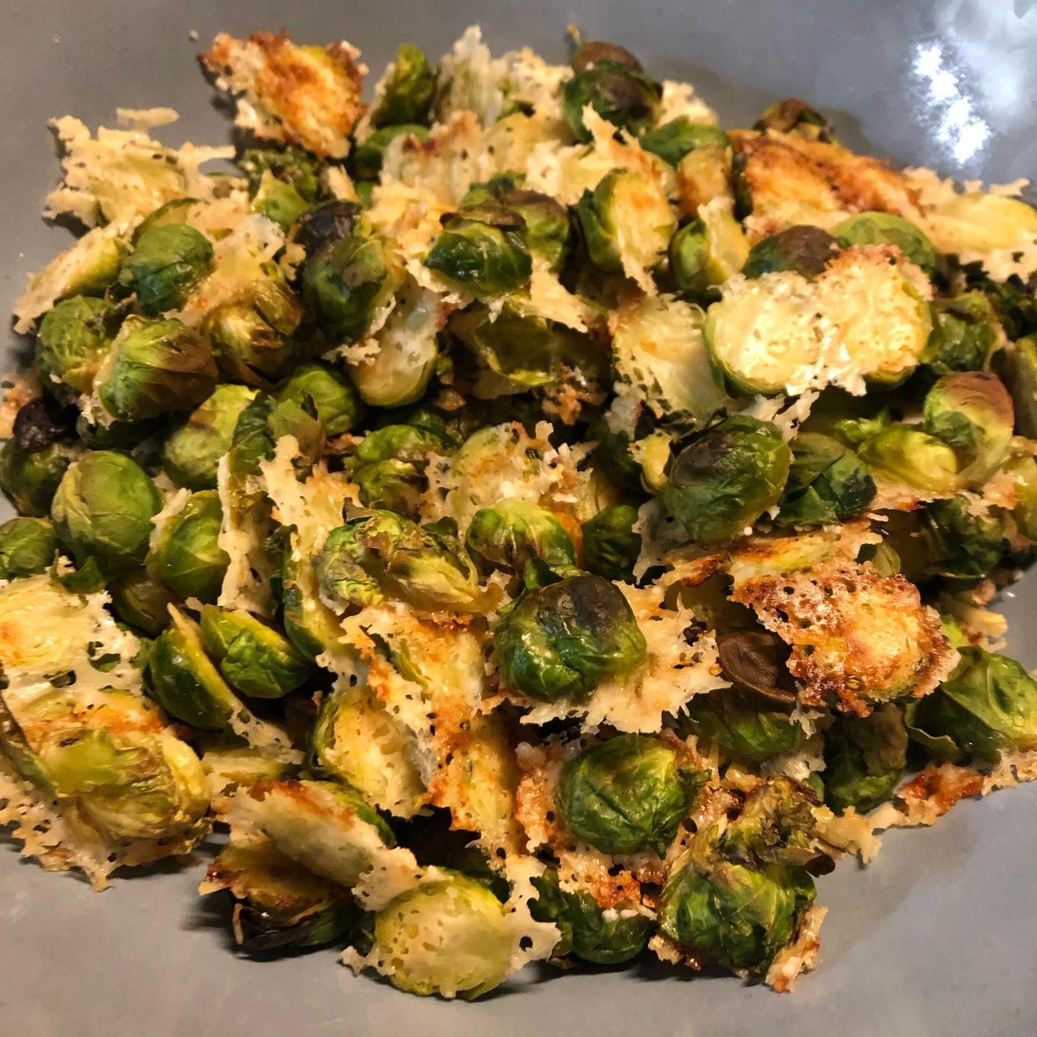 Verwarm oven op 200 graden. Pak een ovenplaat en bedek hem met bakpapier. Smelt ghee en besmeer de bakpapier met de ghee. Bestrooi het rijk met geraspte parmezaan. Snij de spruitjes door de helft en leg met de gesneden kant op de parmezaan. Bestrooi met zout en peper en bak het tussen 15-20 minuten. Wanneer ze gekoeld zijn, breek ze in kleine stukjes en serveer met knoflook mayonaise of komkommer raita.