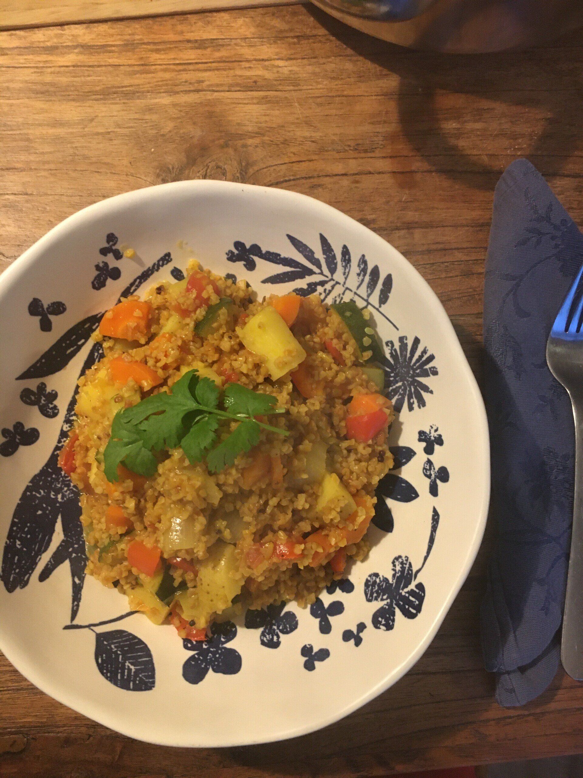 Breng dan het water aan de kook. Verwarm zo nodig de geroosterde granen weer. Doe de groenten bij de bulgur/griesmeel en dan voorzichtig, beetje voor beetje, het kokende water. Draai de vlam laag. Roer alles een keer door met een vork om klontjes te voorkomen en leg een deksel op de pan om de stoom vast te houden. Na 5 minuten kijk je even of de granen al het water hebben opgenomen. Zo niet, dan roert u alles met een vork nog even snel door en laat dan de granen nog een paar minuten zachtjes doorkoken zonder deksel. Haal dan de pan van het vuur en voeg als laatste het citroensap en de gesneden korianderblaadjes of dille toe. Nog een keer goed doorroeren.