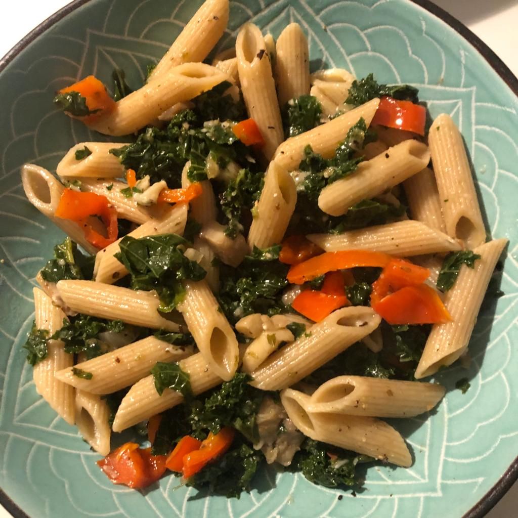 Dit winterse boerenkoolgerecht is geweldig als je zin hebt in boerenkool, maar niet in stamppot. Het is zeker goed voor Pitta-types vanwege de verkoelende aard van boerenkool en pasta, en voor Vata-types vanwege de verwarmende paprika en kruiden. Kapha-types, let op de hoeveelheid pasta en geniet ervan.