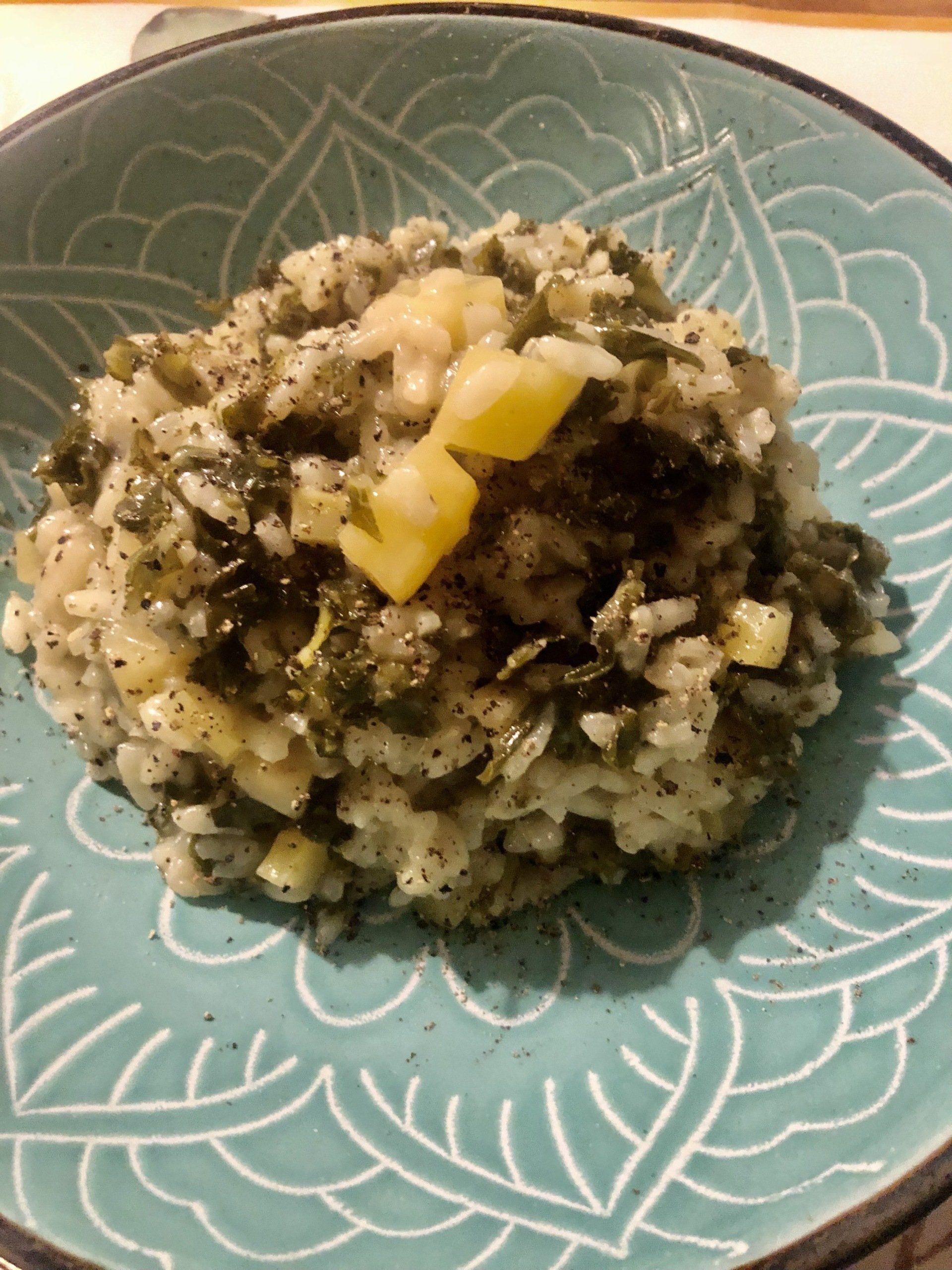 Doe in een pan ghee, snijd de ui in blokjes en voegt het bij de ghee. Laat even zachtjes bakken. Voer er vervolgens de rijst bij, roer goed door en giet er de wijn bij. Laat het tot de kook komen en een paar minuutjes zachtjes koken. Voeg er vervolgens gekookte water erbij, fijn gesneden boerenkool en geschild en in blokjes gesneden knolraap. Doe er nog knoflook en groentebouillon erbij, meng goed door elkaar en laat zachtjes koken. Roer regelmatig door en let er op dat je genoeg water hebt. Wanneer de korrel nog hard is maar heb je geen water, dan voeg je er klein beetje bij. De risotto moet uiteindelijk een soort pap- structuur hebben.